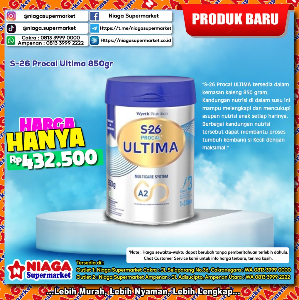 S-26 Procal ULTIMA tersedia dalam kemasan kaleng 850 gram. Kandungan nutrisi di dalam susu ini mampu melengkapi dan mencukupi asupan nutrisi anak setiap harinya. Berbagai kandungan nutrisi tersebut dapat membantu proses tumbuh kembang si Kecil dengan maksimal.